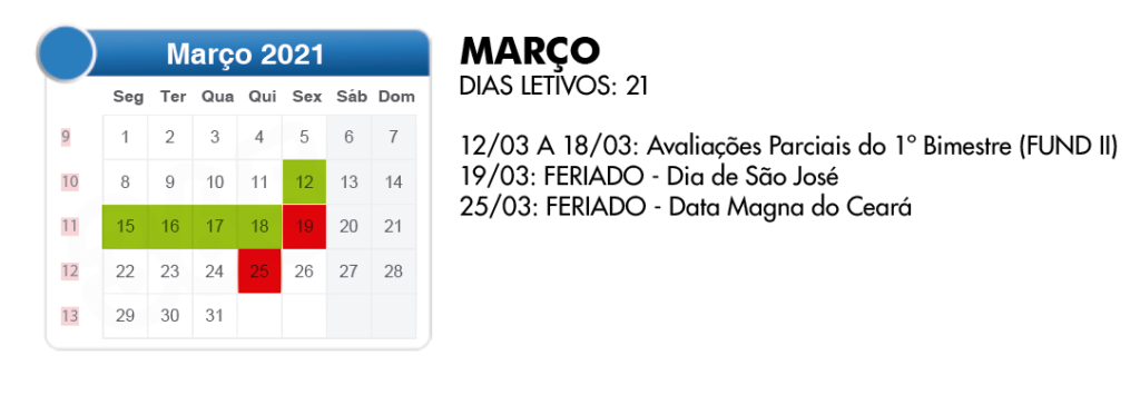 Aproveitamos para reforçar junto aos pais e alunos a programação do mês de março. Lembramos, sobretudo, que esta programação ainda pode sofrer alterações. Se houverem alterações, comunicaremos aos responsáveis via WhatsApp (nosso número: (85) 99748.4850 – por favor, salve este número para receber os avisos e comunicados).